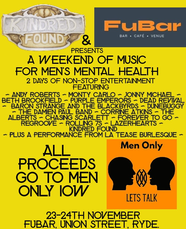 🎸 Exciting News! I'm pleased to be part of an amazing charity weekend at FuBAR in Ryde, supporting "Men Only IOW" mental health services, organised with Kindred Found, the local band.